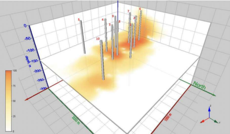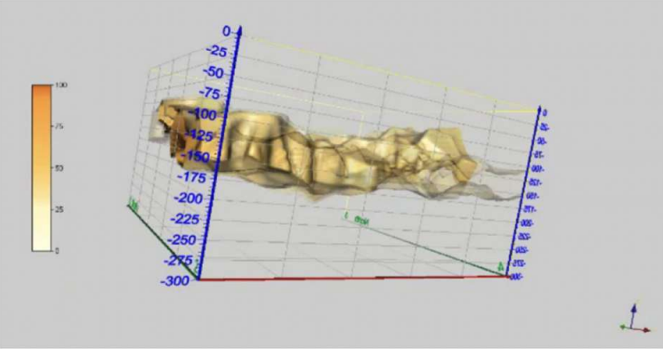 Az alábbi képeken a felmérés eredményei láthatók: a kiemelt területek az arany koncentrációját mutatják, az oszlopok pedig a mélységet jelzik.